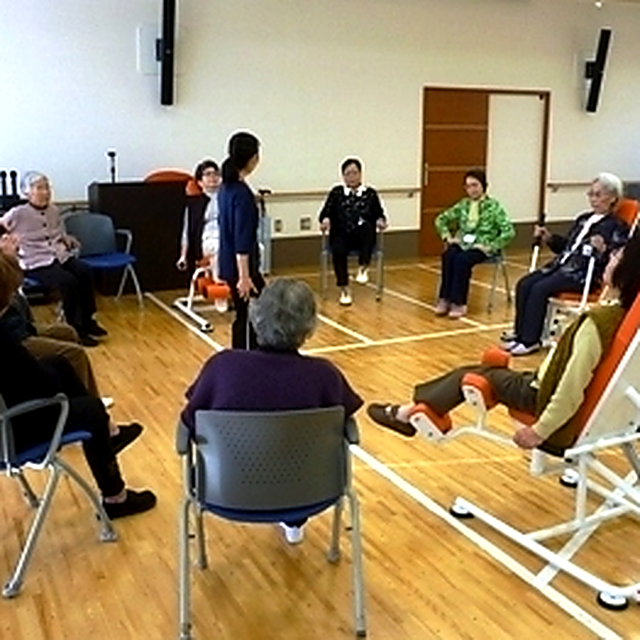 油圧マシンで生活動作能力を支える基礎的体力の低下を抑え、総合的な機能を維持し、また、広いフロアを使い歩行能力の向上を目指します。